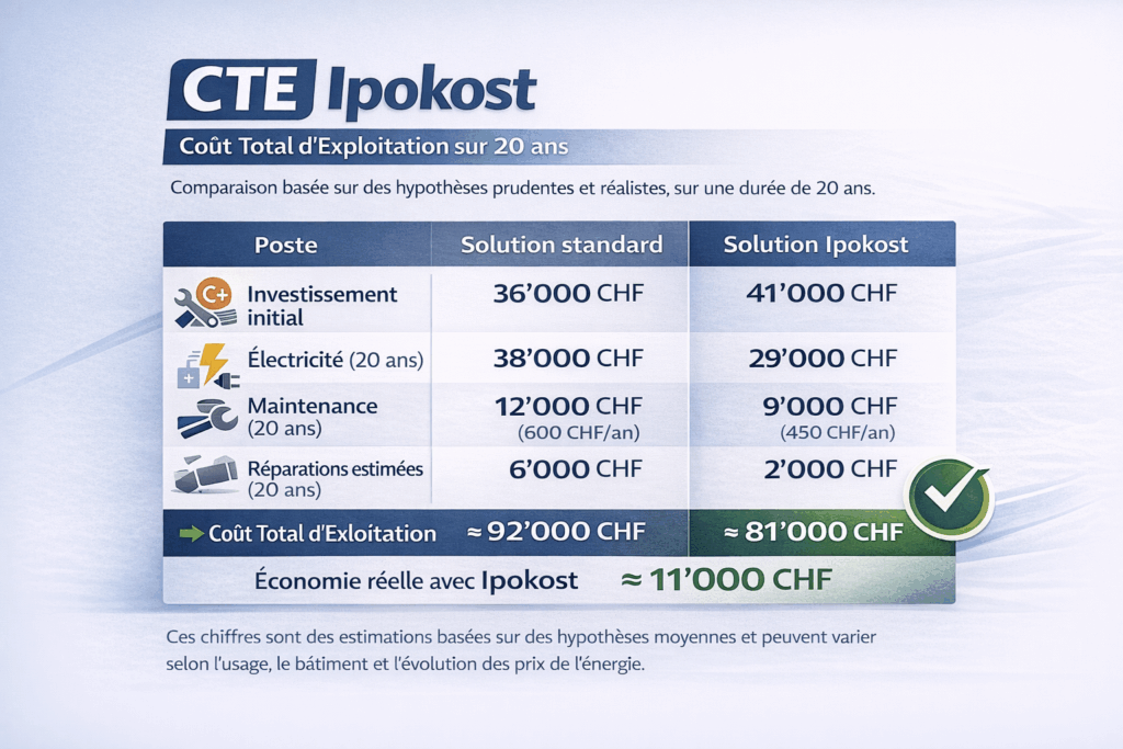 Un coût d’investissement bas est un très bon départ pour un CTE le plus bas possible. Chez Ipokost, nous recherchons au quotidien les meilleurs solutions prix/performance/fiabilité pour nos clients.